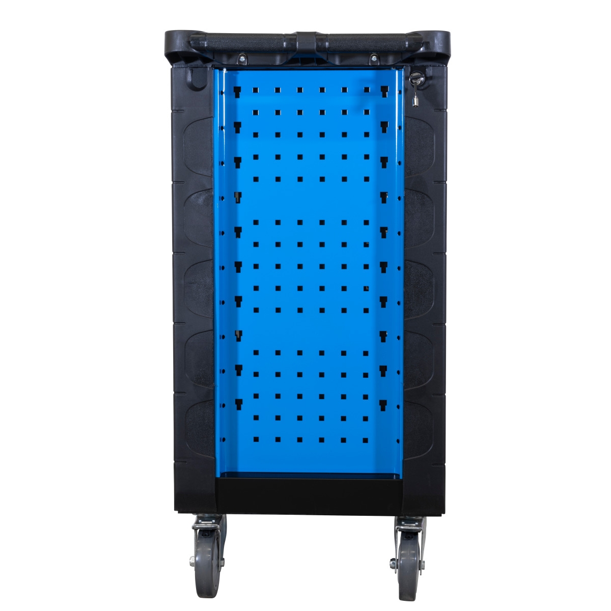 Hochwertig pulverbeschichteter Werkstattwagen mit komfortablen Vollauszug der Schubladen. Der ergonomische Schiebegriff und Kantenschutz erleichtert das Handling.