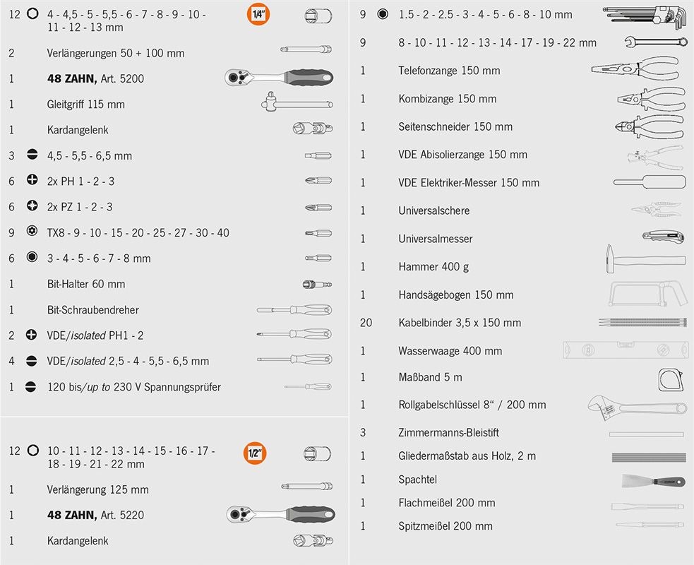 das Werkzeug ist auf Tafeln übersichtlich angeordnet, gegen Herausfallen gesichert und bietet