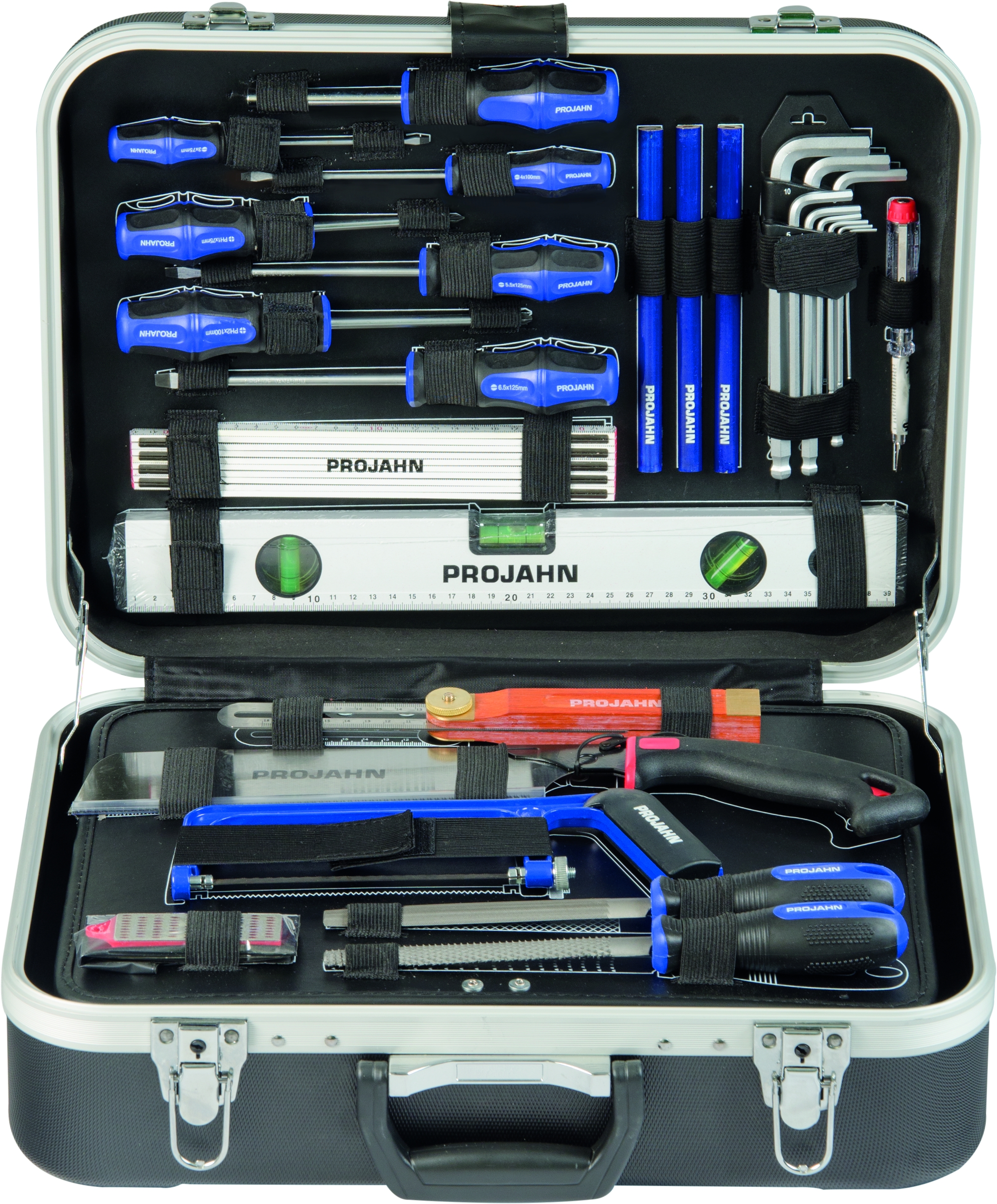Der 92-teilige Werkzeugkoffer aus ABS von Projahn ist sehr robust, das Werkzeug ist auf Tafeln übersichtlich angeordnet und gegen Herausfallen gesichert.